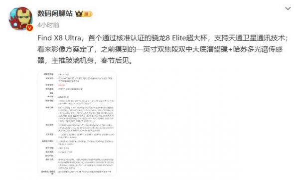据博主@数码闲聊站 透露,这款新机为OPPO Find X8 Ultra,是首个通过核准认证的骁龙8 Elite超大杯手机,支持天通卫星通讯技术。