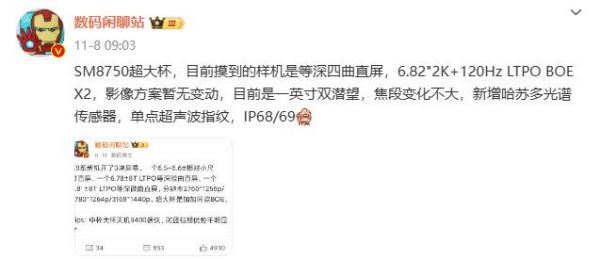 另据以往的爆料显示,OPPO Find X8 Ultra样机将配备一块6.82英寸2K等深四曲直屏,刷新率是120Hz,采用8T LTPO技术,使用京东方X2发光材料;支持IP68/IP69。