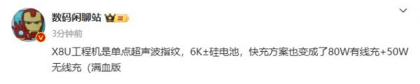 该博主今日的另一份爆料中还提到,OPPO Find X8 Ultra工程机搭载单点超声波指纹,内置6000mAh±容量电池,支持80W有线快充和50W无线快充(满血版)。