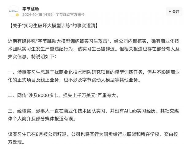 10月21日,界面新闻从知情人士处了解到,字节跳动内部已经调查明确此事为田姓实习生所为。