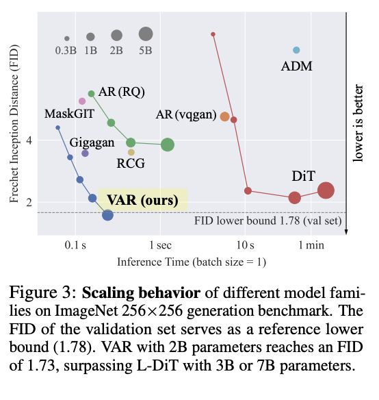这篇论文提出的视觉自回归建模(VAR)方法首次证明了GPT式模型可以在图像生成方面超越扩散模型——这是许多人认为不可能的里程碑。在ImageNet 256×256基准测试中,VAR将图像质量评估指标FID从18.65提升至1.73,生成速度提高了20倍。