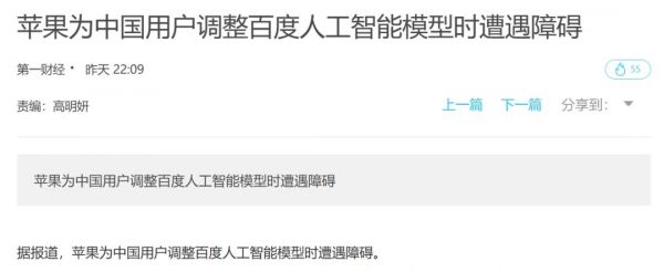 昨晚第一财经报道了条快讯, “据报道,苹果为中国用户调整百度人工智能模型时遭遇障碍。”