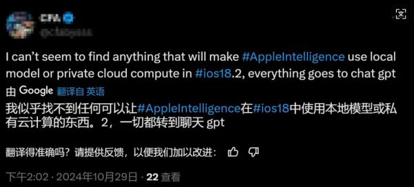 苹果的Apple Intelligence可能真不太行,10月28日,Apple Intelligence在美国等部分国家上线。但用户体验后纷纷给出差评,主要原因可以概括为,Apple Intelligence就是套壳的GPT,用户提的需求都会跳转到GPT。