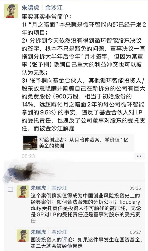 12月5日,知名投资人、金沙江创投主管合伙人朱啸虎接连发朋友圈,对前金沙江创投主管合伙人、现月之暗面联合创始人张予彤直接开炮。在当天早些时候,朱啸虎通过两条朋友圈对“月之暗面创始人杨植麟和联合创始人兼CTO张宇韬近期被循环智能时期投资人提起的仲裁事件”进行了回应。