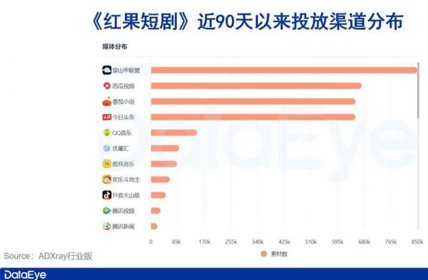DateEye 发布的数据也验证了这一点,截至 11 月 4 日,红果短剧共投放了 213 万+组素材,投放渠道主要集中在字节系。
