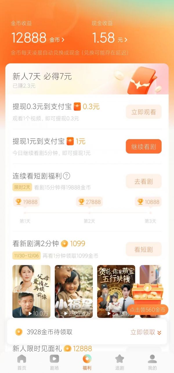 在这些设计基础上,红果还推出了“网赚模式”,宣传时强调“看短剧,领补贴”,在 App 内则用现金激励用户签到、持续追剧,比如“继续看剧 5 分钟,即可提现 1 元”“观看 1 个视频,即可体现 0.3 元”。