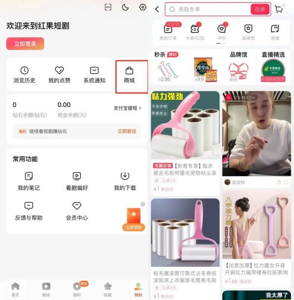 在红果 App 首页,点击个人页面,用户就能看到商城入口,用抖音账号登录的用户还能看到过往在抖音电商消费的订单。