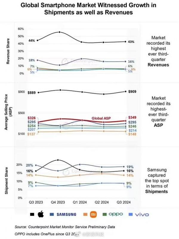 【Counterpoint:#小米Q3智能手机出货全球第三#,#Pro系列贡献iPhone销量一半#】Counterpoint 今天发布 2024 年 Q3 各地区市场智能手机数据报告称,该季度全球智能手机市场同比增长 2%,出货量达到 3.07 亿部。具体来看,呈现如下特征: