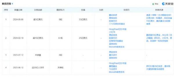 2024年8月,月之暗面公布B轮融资,融资额超3亿美元,投资机构包括腾讯、高榕创投和阿里巴巴,投后估值达到33亿美元。