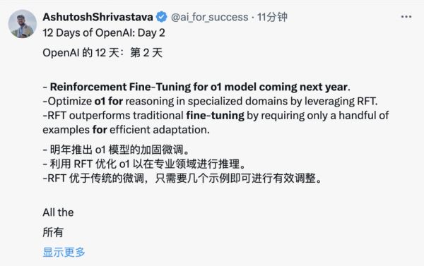 强化微调(RFT)将于明年推出,专门针对o1模型。