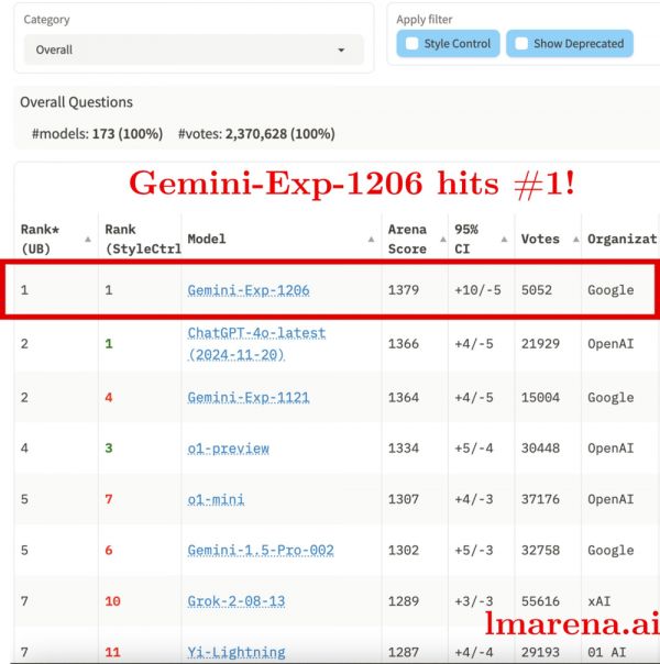 而就在OpenAI发布会召开前,Google推出的新模型gemini-exp-1206在大模型竞技场LMSYS Chatboat Arena中再次登顶,力压OpenAI的GPT-4o-1120。