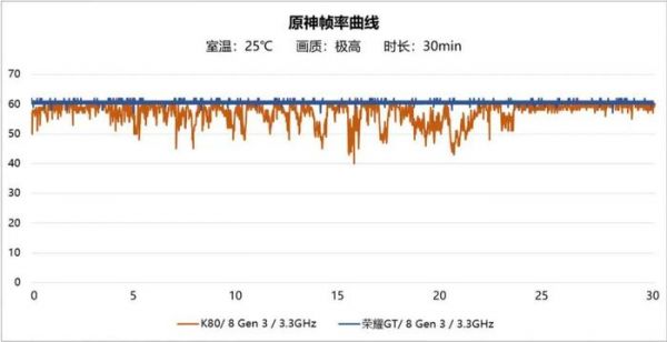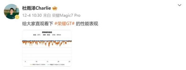 另外,荣耀GT系列产品经理@杜雨泽Charlie 在近日晒出一张原神帧率曲线图,直观展示了荣耀GT的性能表现。