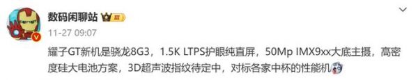 此外,结合博主@数码闲聊站 的爆料来看,荣耀GT还将配备一块1.5K LTPS护眼纯直屏,后置5000万像素IMX9xx大底主摄,采用高密度硅大电池方案,支持100W有线闪充,有望搭载3D超声波指纹,“对标各家中杯的性能机”。