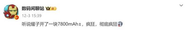 此外,这位博主近日的另一份爆料中还提到:“听说耀子开了一块7800mAh±,疯狂,彻底疯狂”。
