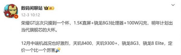 据悉,在今年10月举行的的荣耀Magic 7系列发布会上,荣耀CEO赵明正式宣布,荣耀GT系列将成为独立产品线,定位为“更懂年轻人的全新性能科技系列”,并确认首款产品将于年底发布。