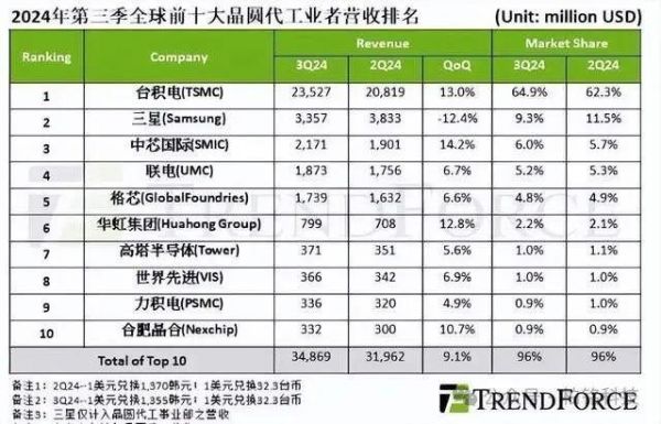 此前三星也曾获得高通的订单,但是生产的骁龙8gen1处理器出现发热问题,最终高通从骁龙8gen2起都全数交给台积电,这也导致三季度三星的芯片代工营收下滑12.4%,成为前十大芯片代工企业中唯一下滑的芯片代工企业。