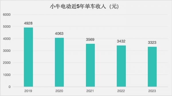 国内外市场双双实现销量的上涨,和小牛电动的“降价”策略有关。小牛电动一直走的是高端化路线,但第三季度单车收入(每辆电动滑板车的收入)为2970元,同比下降5.1%。而这一趋势已经持续了五年,从2019年至2023年,小牛的单车收入逐年下降,从4928元一路降至3323元。