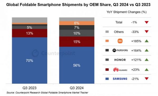 三星以56%的市占率,稳坐全球折叠屏手机出货量头把交椅,在如此严重的采购量下降拖累下,全球折叠屏手机的出货量却仅下跌1%,小米、摩托罗拉、荣耀和华为功不可没。据悉,今年第三季度,华为出货量同比上涨23%,而荣耀、摩托罗拉和小米出货量同比涨超100%,分别为121%、164%和185%。