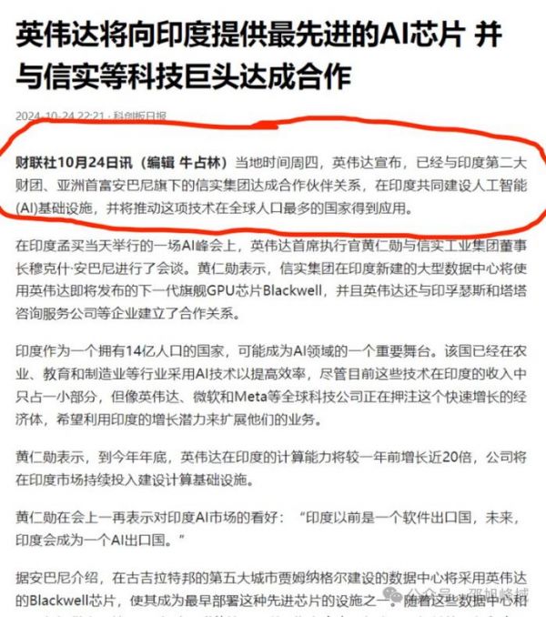 英伟达是一家主要提供芯片的公司,在今年6月上旬,其市值超越微软和苹果,成为全球第一,现在貌似在3.6万亿美金左右(快赶上日德英法的年度GDP了)。该公司是美籍华人(台湾)黄仁勋创立的,该公司也垄断全球将近80%的芯片,包括大g。由于眼下全球已经完全进入AI时代(可向前翻看一下个人文章),提供算力的芯片成了第一刚需,所以你基本能懂英伟达和黄仁勋在这个球上的分量——类似于靠天吃饭的苍头们的“天”。由于2025年全球对芯片的需求将更加暴增,所以英伟达和黄仁勋····有数据显示,光美国5大科技巨头(也都在全球市值最高公司前10)对H100或者等效GPU的需求量在1240万块(一块的价值在2万到2.5万美元),这还不算别的芯片,更没算别的公司、别的国家的公司的相关需求。而英伟达现在的产能极限,只能达到年产700万块H100或者等效GPU,所以黄仁勋现在最急的是什么?对,拓展产能,到最能提供相关人才、适合投资建厂合作的地方拓展,美国的900多万平方公里已经托不起这个事情。他的第一着眼点,似乎是印度,如下是10月份英伟达和亚洲首富旗下集团的合作计划: