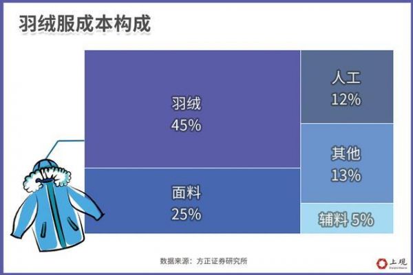 根据方正证券研究所估算,生产一款羽绒服,其中最主要的成本来自羽绒,占整体成本的45%左右。