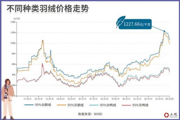 而今年的羽绒价格最高值达1227.66元每千克,创下最高纪录,且全年都维持在历史高位。