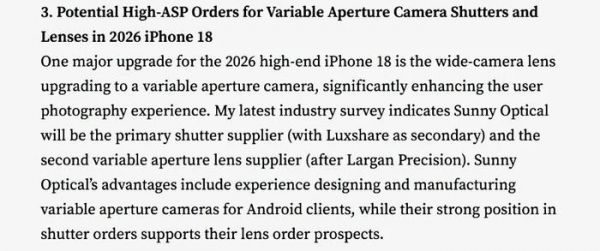 而在更早前,苹果分析师@郭明錤曾表示,iPhone 18 Pro系列的相机将有一项重大升级,苹果将为该系列机型的广角主摄镜头加入可变光圈设计。