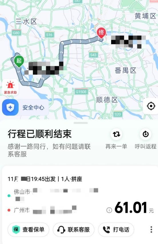 第二次的经历则让小默更加心惊胆战。“晚上8点左右我计划打车从佛山回广州,考虑到车费比较贵,所以选择以拼车的方式上了一辆顺风车,高德系统上也显示只有我和另外一名乘客。”