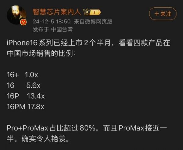 此外,近日有数码博主公布了iPhone 16系列四款机型在国内市场的销售比例数据。以iPhone 16 Plus为基准,iPhone 16系列的销售比例分别为:iPhone 16 Plus为1倍基准;iPhone 16为5.6倍基准;iPhone 16 Pro为13.4倍基准;iPhone 16 Pro Max为17.8倍基准。