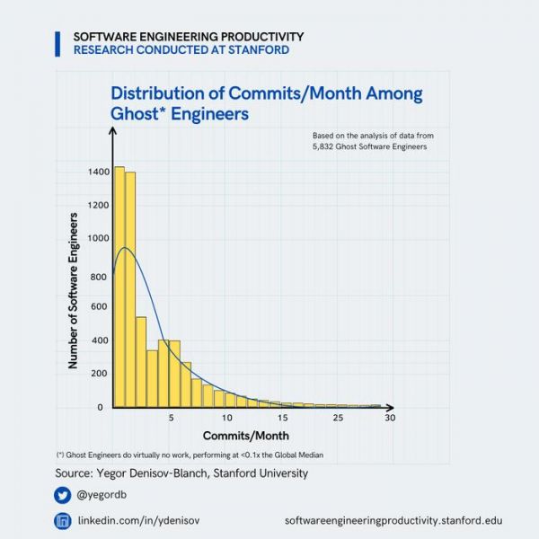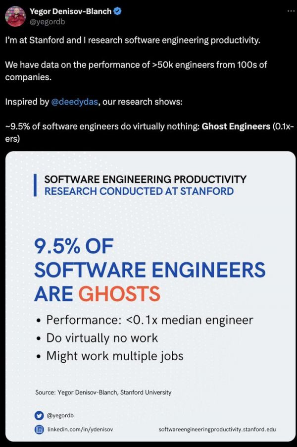 Denisov-Blanch 在 X 上发帖称,约有“9.5% 的软件工程师几乎什么正事也不做”。他们贡献的代码量极少,不禁让人怀疑他们要么在偷懒、要么是偷偷在搞开发副业。他还把这些吃白食的技术人称为“幽灵工程师”——即“摸鱼工程师”。
