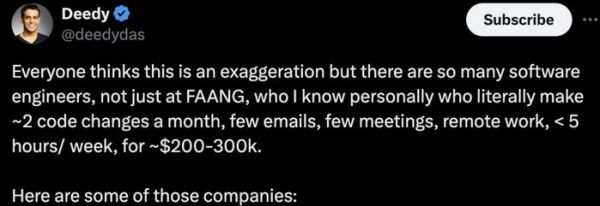 硅谷投资者 Deedy Das 在其 X 帖子中提到,“每个人都觉得这是在夸大其词,但确实有不少软件工程师……我就认识一些,他们每月只修改一、两次代码,发送几封电子邮件,参加几次会议。他们远程办公,每周工作时间加起来不足 5 个小时,年薪却能达到 20 万到 30 万美元。”