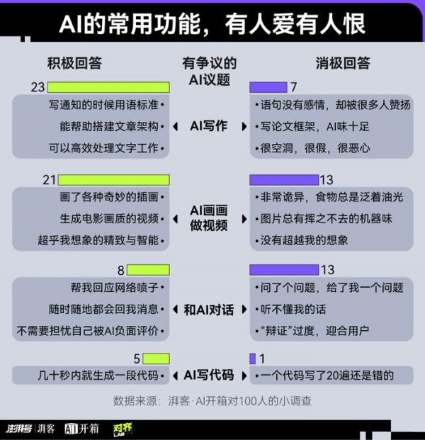 但调查结果显示,大家对于 AI 生图、AI 视频、AI 写作、AI 对话这些最常见的功能,却是有人喜爱有人嫌弃。