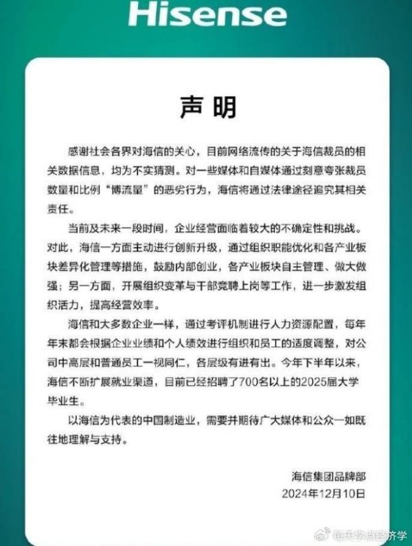 理解了这一点,或许就好理解,为何海信的这份声明,不仅辟谣了网传的大规模裁员的消息,还表示将针对一些媒体和自媒体通过刻意夸张裁员数量和比例的“博流量”的恶劣行为,通过法律途径追究其相关责任了。