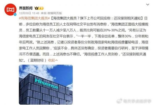 12月9日午间时分,来自蓝鲸新闻的一篇题为《海信集团大裁员?旗下上市公司回应称:还没接到相关通知》的文章发布之后,引发多家媒体、自媒体跟进;