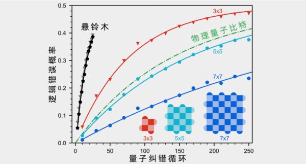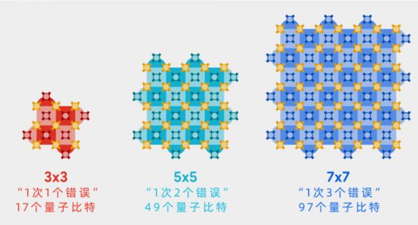 在表面码量子计算中,每个由n × n个量子比特组成的晶格叫做表面码,每个表面码代表一个单独的逻辑量子比特。表面码晶格越大,它能够容忍的错误就越多。预期随着晶格规模的增大,逻辑量子比特将得到更好的保护,逻辑量子比特的性能也会随之提升。