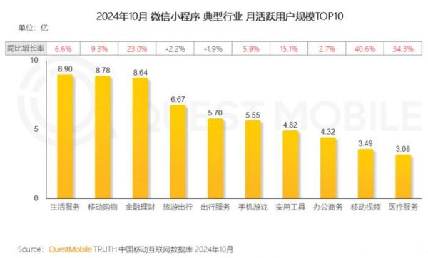 图源:QuestMobile从典型行业月活跃用户规模TOP10统计来看,微信小程序在生活服务、移动购物、金融理财三个领域的月活跃用户规模分别达到了8.9亿、8.78亿和8.64亿,同比增长率分别为6.6%、9.3%和23%。