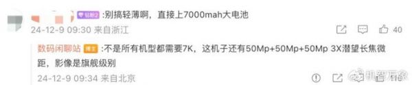 此外,该博主还透露,“这机子还有50Mp+50Mp+50Mp 3X潜望长焦微距,影像是旗舰级别”“我摸的是超声波,只是还没确定,就先不写了”针对网友提出的“马达呢?”的问题,该博主回应称,“盲猜是0809加厚版或者9595,大概是这个振幅”针对网友提出的“啥时候上”的问题,该博主称,“目前排期和U一起,保四争三”。虽然该博主并未透露这款新机的机型,但是根据网友互动来看,该机大概率是vivo X200s。
