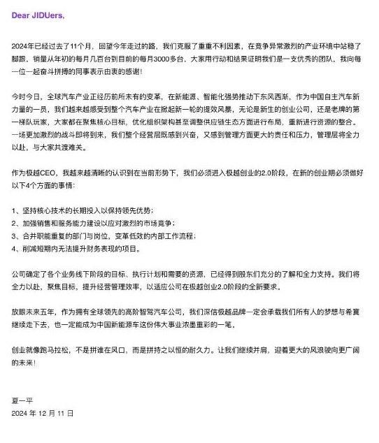 来源:猎云网12月11日,极越CEO夏一平发布内部信宣布组织调整。他提到,在当前形势下,公司必须进入到极越创业的2.0阶段,并且在新的创业期必须做好以下4个方面的事情:坚持核心技术的长期投入以保持领先优势;加强销售和服务能力建设以应对激烈的市场竞争;合并职能重复的部门与岗位,变革低效的内部工作流程;削减短期内无法提升财务表现的项目。