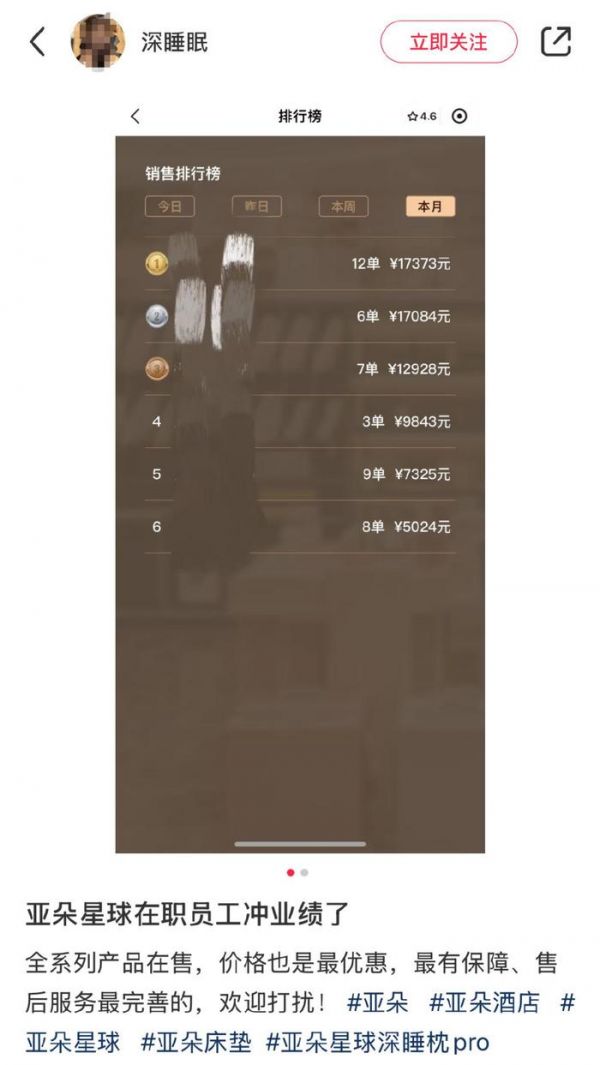 如果你看多了两眼,就会引来店员热情上前介绍。据《互联网品牌官》了解,亚朵酒店每位员工的绩效,与包括枕头在内的产品销量直接挂钩。也就是说,每位员工身上都是背负着卖货的KPI。所以,在亚朵,从前台到保洁再到经理,无论职位高低,他们都得扛起枕头销售这一层身份。夸张点说,整个亚朵酒店就是一个沉浸式的枕头带货场。有时候光靠线下面销还不能完成KPI,这也就解释了为什么在社交媒体上遍布“冲业绩”的亚朵员工。