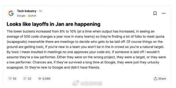 【消息称#谷歌正酝酿新一轮裁员风暴#,低绩效员工比例提至10%】根据职场匿名论坛 Team Blind 上最新流传的热议帖子,谷歌员工担忧公司将于明年 1 月启动新一轮裁员。
