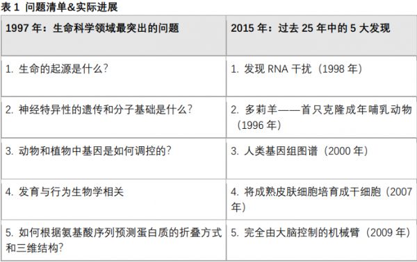 维基百科列出了包括物理、化学、生物、医学和神经科学在内,14个不同学科的未决问题清单。那么我们是否可以顺理成章地期待,各领域大牛在十年后欢聚一堂,提名答出这些问题的聪明人,颁发奖金奖牌,然后编制下一个“十大问题清单”?出人意料的是——或许也可以说意料之中——如果列出1990年到2015年生命科学领域的所有重大发现,再对比此前列出的问题清单,你会发现两者几乎没有交集(表1)。