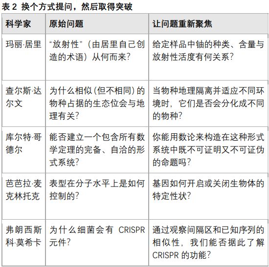 科学界列出的既有问题(例如表1和表2左栏所列)通常都十分笼统,无法启发新的研究方向。要回答这样的问题,往往需要重新组织、表述原始问题,使其重新聚焦。这会揭示问题新的方面,并且只有在对现象有了深刻洞察后才可能做到。