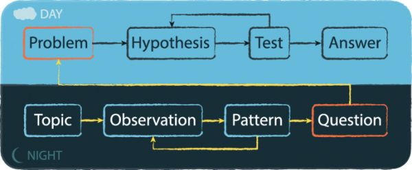 因此可以说,没有计划、也不试图重构或解决特定问题的夜间科学,可能反而最卓有成效。一个抛却假设的科学家可以自由地探索、建立联系。从某种意义上讲,对事物任何应然的预期——也就是假设,都是一种负担,可能会阻碍我们潜在的新想法。一旦夜间科学阐明、重构问题,研究人员就可以充分运用日间科学的力量来解决它。从这个意义上讲,重大发现常常既是答案,也是问题本身。