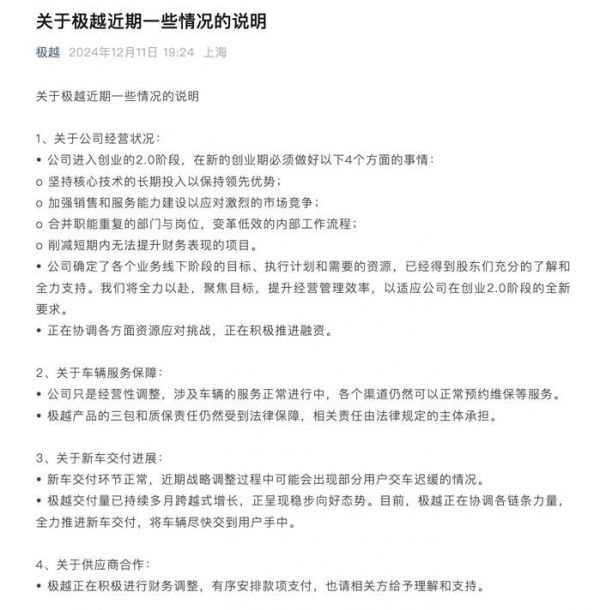 12月11日晚,极越官方出面回应了各种传言和消息。极越在情况说明中表示,公司只是经营性调整,涉及车辆的服务正常进行中,各个渠道仍然可以正常预约维保等服务。新车交付环节正常,不过可能会出现部分用户交车迟缓的情况。而针对之前供应商讨要欠款的情况,极越官方表示正在积极进行财务调整,有序安排款项支付,希望相关方理解和支持。