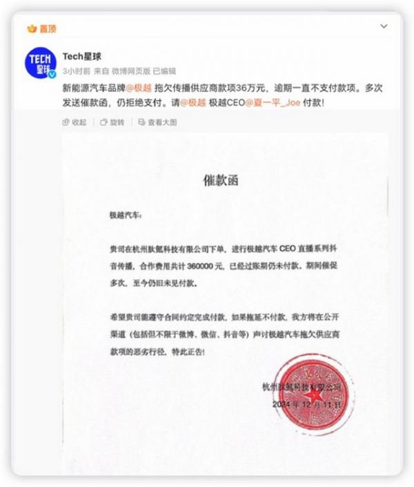 在夏一平发布内部信之前,12月11日中午,科技媒体Tech星球账号发文,控诉极越汽车拖欠传播供应商款项36万元,逾期一直不支付款项,多次发送催款函,仍拒绝支付。