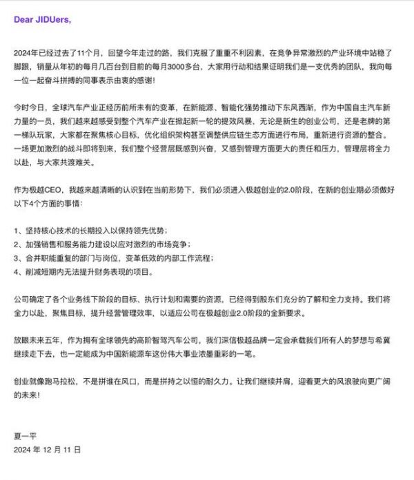 12月11日极越汽车CEO夏一平发布的内部信