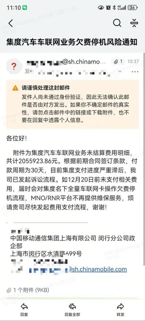 另外,记者也获得了一份中国移动通信集团上海有限公司闵行分公司政企部发给极越汽车的邮件。邮件内容为,集度汽车车联网业务未结算费用明细共计20.56万元。“12月20日前未支付相关费用,届时会对集度名下全量车联网卡操作欠费停机流程,MNO/RNR平台不再提供维保服务。”