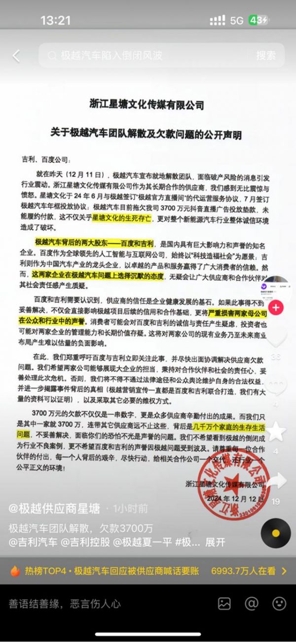今日,极越汽车官方直播间的代运营服务商浙江星塘文化传媒有限公司,在其官方抖音号发布一则公开声明,呼吁尽快解决供应商欠款问题,结清3700万元欠款,并艾特了极越汽车背后两大股东百度和吉利,“百度与吉利立即关注此事,不希望两大集团的声誉因极越问题受到波及。”