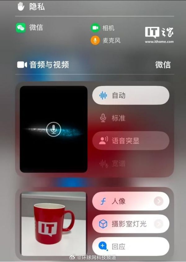 其次,除分屏功能之外,微信视频聊天还带来了一项重磅升级,那就是接入了苹果原生的视频效果功能。现在开启微信视频通话之后,下拉控制中心,便能看到音频与视频效果的选项。除了可以设置麦克风的收音模式,我们还可以使用苹果自带的人像模式、摄影室灯光效果与回应功能。(via IT之家)