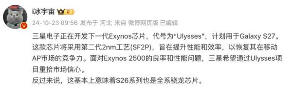 至于S系列旗舰什么时候才能够再次搭载三星自研Exynos芯片,参考博主@i冰宇宙 的爆料: