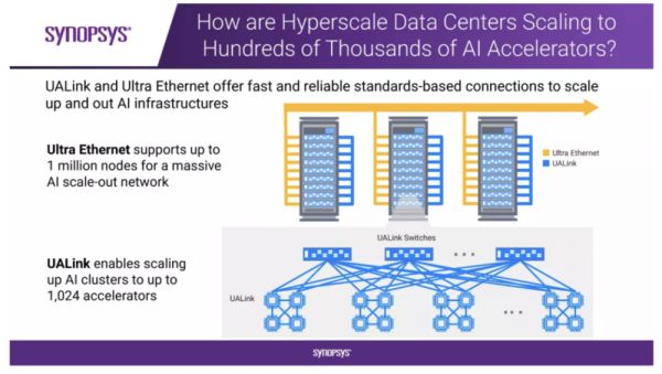其中,Ultra Ethernet IP解决方案基于经过硅验证的技术构建,将实现1.6 Tbps的超高带宽和超低延迟,从而扩展(横向)大规模AI网络。而新思的UALink IP解决方案将提供每通道高达200 Gbps的带宽和内存共享功能,以扩展(向上)加速器连接。